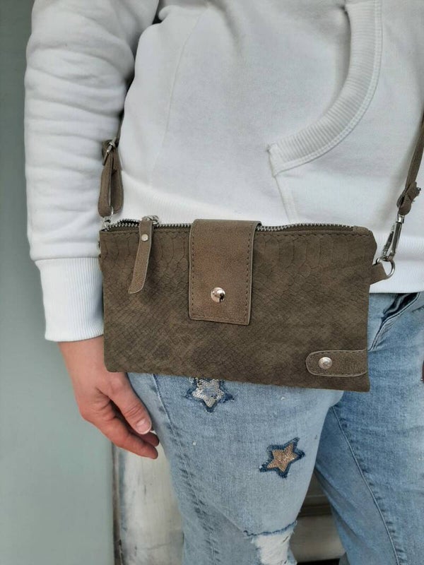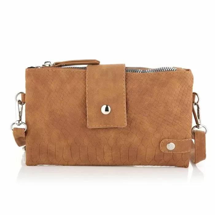 Uitklapbaar schoudertasje Ivy met slangenpatroon camel