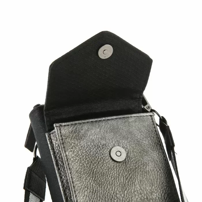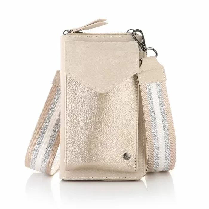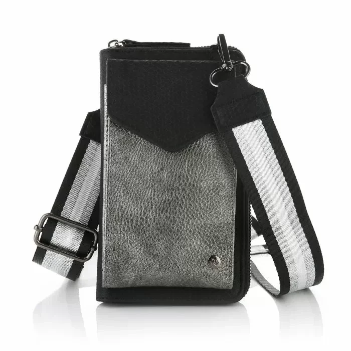 Hij is uitgevoerd in een effen kleur met een metallic voorvak in dezelfde kleurstelling. De bovenkant is af te sluiten met een rits. Achter de rits bevinden zich meerdere vakken voor papiergeld en pasjes. Voorop zit een apart vak waar je je telefoon in kunt bewaren, deze is af te sluiten met een magneetsluiting.