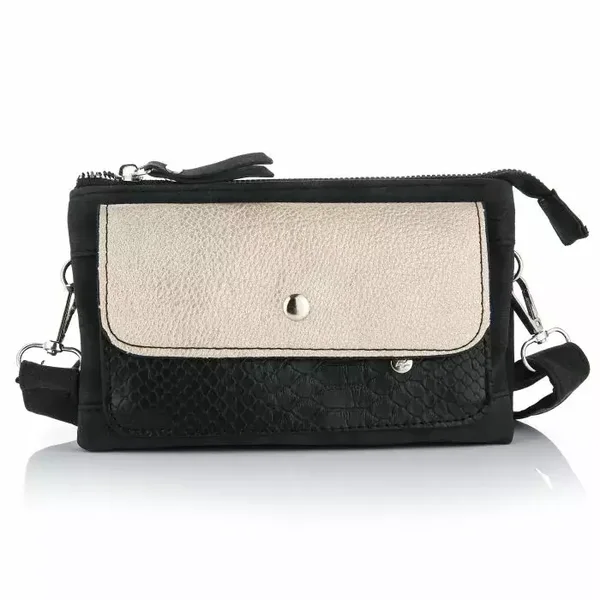 Schoudertasje met metallic voorflap. Het tasje heeft meerdere vakken, te beginnen met het voorvak dat af te sluiten is met een magneetsluiting. Bovenop bevinden zich een rits waaronder 3 vakken zitten. Twee grot vakken en een klein vakje middenin. Ook aan de achterkant bevind zich nog een rits met een vak. Al met al heb je met dit tasje dus voldoende verschillende vakken en ben je dus geen uren naar je spullen aan het zoeken.