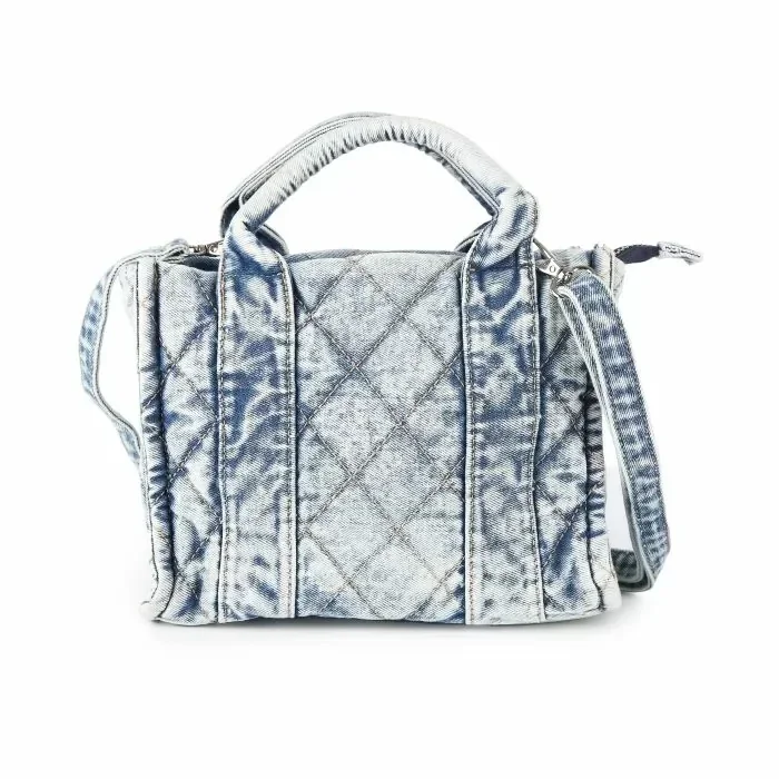 De tas is verkrijgbaar in 3 verschillende kleuren namelijk Light Blue, Dark Blue en Black. De afmetingen van de tas zijn 25 * 19 cm en hij is af te sluiten door middel van een rits. Binnenin bevindt zich één groot vak en aan beide zijkanten van de tas vind je nog twee kleinere vakjes. Hiervan is er één open en de andere is ook weer af te sluiten door middel van een rits.
