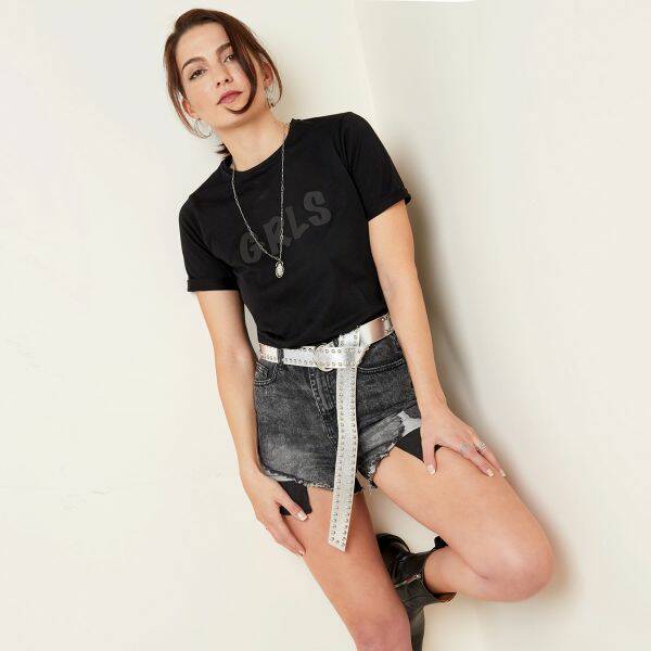 Pimp je outfit met deze metallic PU-riem met studs en dubbele lussluiting. Ook verkrijgbaar in de kleuren goud en zilver.